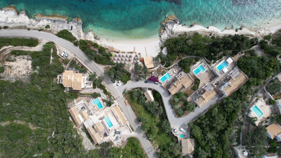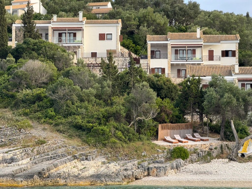 Located on the white-pebbled Kamini beach in Gaios, Paxos, this is a premium beachfront complex designed for relaxation and privacy.